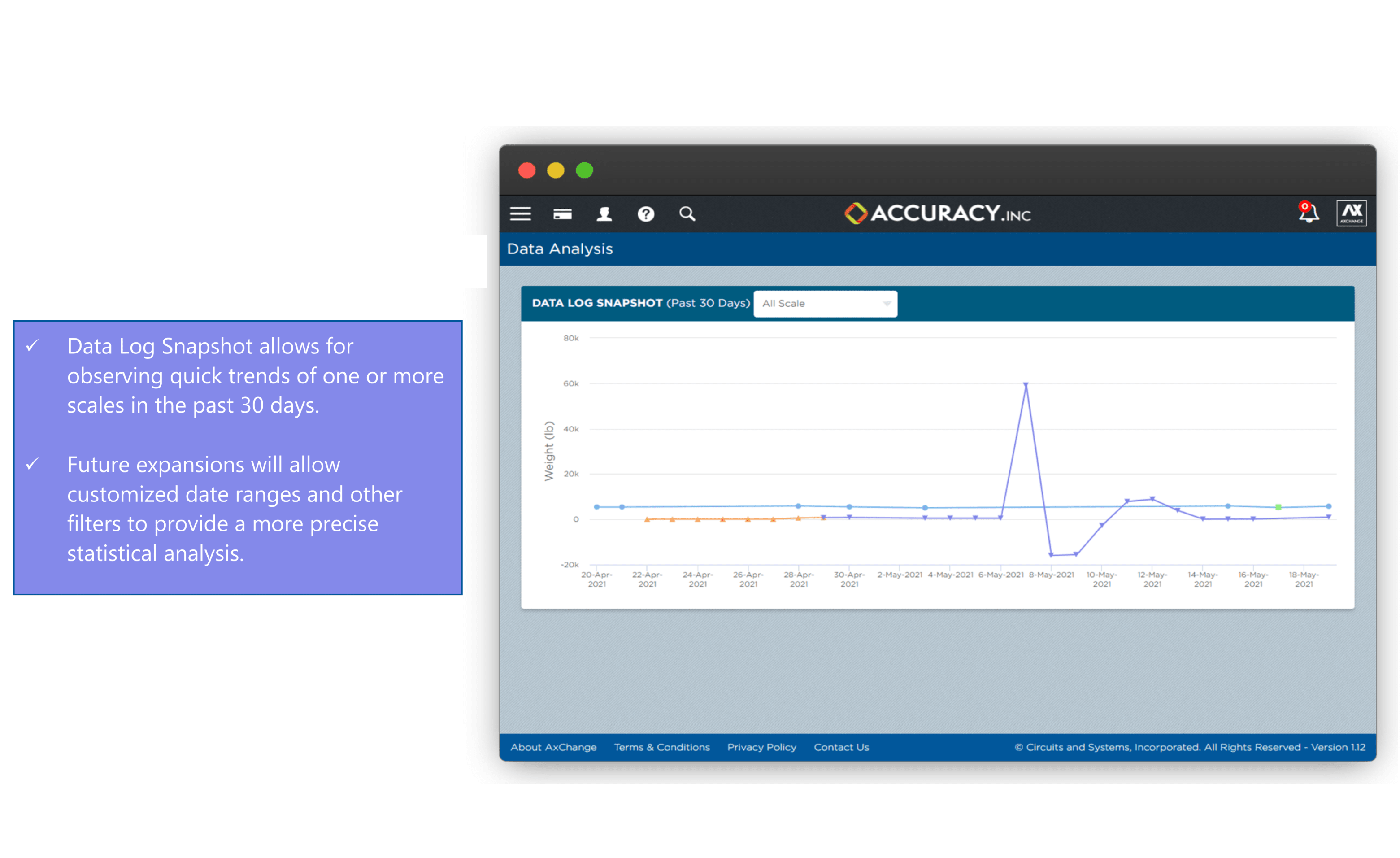 AxChange allows you to monitor weights on multiple scales at your location. Being a cloud application, AxChange can be accessed on any device including your PC, iOS and Android devices. With real time weight tracking, customized alerts and hierarchical access control, AxChange can solve many issues brought about by weight application especially in a remote driven world.
